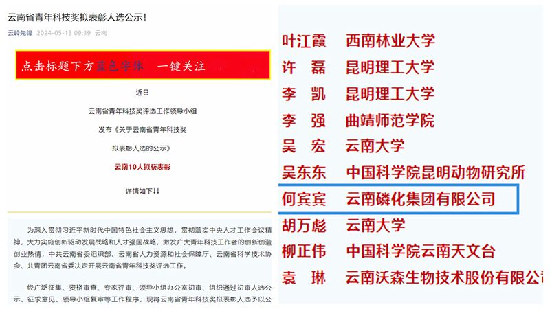 近日,云南省青年科技獎(jiǎng)評(píng)選工作領(lǐng)導(dǎo)小組發(fā)布了《關(guān)于云南省青年科技獎(jiǎng)擬表彰人選的公示》,公司研發(fā)中心磷化工團(tuán)隊(duì)負(fù)責(zé)人何賓賓擬獲得“云南省青年科技獎(jiǎng)”榮譽(yù)。